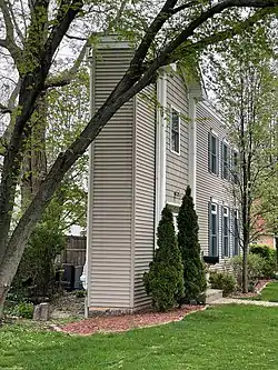The home was built in 2003 on a small, irregularly shaped lot at 970 Chestnut Street[lower-alpha 1] in the Chicago suburb of Deerfield. The house is trapezoidal in shape, rather than the traditional rectangular shape,[3] which has inspired its nickname, the "pie house", due to its apparent resemblance to a slice of pie.[4] The triangular lot it sits on measures only 3,876 square feet (360.1 m2), which contributes to the house's unusual shape.[5] Despite outcry from neighbors, the village of Deerfield was not able to force any changes to be made to the design of the house as it met all building codes and was not legally required to be changed in any way.[3] The house is two stories tall, and has a finished basement.[6] It has more than 1,600 square feet (150 m2) of floor space, and contains two bedrooms, two full bathrooms, and an additional half bathroom.[6] The ground level of the home follows an open concept plan.[6]