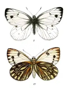 Male upperside ground colour is white. Forewing has veins black, costal and terminal margins narrowly, apex more broadly, black; the inner margin of the black at apex forms an even curve; a large round black spot in middle of interspace 3, the lower discocellular edged on either side with black and the base of the wing irrorated with black scales. Hindwing: with a dark greyish appearance due to the dark markings of the underside that show through by transparency; veins black; a black costal spot a little before the apex, and the base of the wing heavily irrorated with black scales. Underside: forewing white, veins edged with black scaling, the round black spot in interspace 3 as on the upperside; apex and terminal margin suffused with yellow that decreases posteriorly on the latter. Hindwing: yellow, all the veins very broadly edged with black that gives an appearance of streaks to the ground colour; precostal area edged with deep cadmium yellow. Antennae, head, thorax and abdomen fuscous black. Female undescribed.[2]