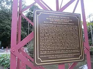 The Piermont hand-cranked drawbridge, also known as the Sparkill Creek Drawbridge, was originally built in 1880 by the King Iron Bridge Company, a company from Cleveland, Ohio, that constructed more than 10,000 bridges over six decades. The hand-cranked drawbridge is used as a pedestrian walkway providing a link to Tallman Mountain State Park. This bridge is the only hand-cranked drawbridge in Rockland County and perhaps in the United States. Back in the day, fishermen on sloops heading up and down the creek got out of their vessel, cranked up the drawbridge, sailed across, got out of their vessel and cranked down the drawbridge for vehicular traffic. The whole bridge was dismantled piece by piece, sent off-site for restoration and restored to its original state after a complete forensic analysis. Allan King Sloan, the great-great-grandson of the company's founder, provided some of the information that is on the historical marker nearby and attended the dedication ceremony on August 7, 2009.