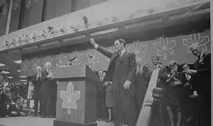 Young Trudeau opposed conscription for overseas service,[20] and in 1942 he campaigned for the anti-conscription candidate Jean Drapeau (later the mayor of Montreal) in Outremont.[21] Trudeau described a speech he heard in Montreal by Ernest Lapointe,[22] minister of justice and Prime Minister William Mackenzie King's Quebec lieutenant. Lapointe had been a Liberal MP during the 1917 Conscription Crisis, in which the Canadian government had deployed up to 1,200 soldiers to suppress the Quebec City anti-conscription Easter Riots in March and April 1918. In a final and bloody conflict, armed rioters fired on the troops, and the soldiers returned fire. At least five men were killed by gunfire and there were over 150 casualties and $300,000 in damage.[23]: 504 [24]: 60 In 1939, it was Lapointe who helped draft the Liberals' policy against conscription for service overseas. Lapointe was aware that a new conscription crisis would destroy national unity that Mackenzie King had been trying to build since the end of World War I.[25] Trudeau believed Lapointe had lied and broken his promise. His criticisms of King's wartime policies, such as "suspension of habeas corpus", the "farce of bilingualism and French-Canadian advancement in the army," and the "forced 'voluntary' enrolment", was scathing.[26]