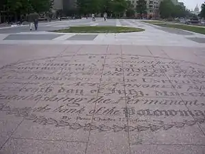 - In 1980, Western Plaza (subsequently renamed to "Freedom Plaza") opened in downtown Washington, D.C., adjacent to Pennsylvania Avenue, N.W. A raised marble inlay in the Plaza's surface depicts parts of L'Enfant's 1791 plan for the City of Washington. The inlay contains an oval bearing the title of the plan followed by the words "By Peter Charles L'Enfant".[63][64]