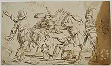 Quast was influenced by the French engrapher Jacques Callot and even called the Dutch Callot.[18] With his caricatured images on often small panels, Quast provided commentary on the Golden Age.[19] He produced finished drawings for sale, often on parchment, and these included landscapes, cityscapes and biblical scenes. Some of his works were engraved,[16] likely by Salomon Savery.