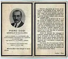 A career officer, Dodi had participated in the First World War as a cavalry captain in the "Cavalleggeri di Lucca" Regiment. Starting from 1921, he taught at the Cavalry Application School in Pinerolo; he later rose to the rank of brigadier general in the Army reserve.[1][2][3]