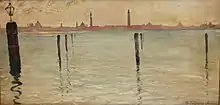 In 1887, he exhibited successfully at the Esposizione di Venezia; and in 1891, he displayed the paintings Pescatori, Silenzio, Sera, Laguna, Case di pescatori in Milan.[2] In 1889, he won a bronze medal at the Universal Exhibition of 1889 in Paris and took part in the Munich International Exhibition of the same year, as well as later editions.[3] In 1895, his canvas Tristezza (Sadness) won awards in Venice, and again the next year, this time in Berlin.[4]