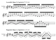 Examples of virtuoso works are the Violin Concertos Op. 3 with their associated Capricci, and the Violin Sonata Op. 6 with one Capriccio. Both works, and especially Op. 3, were standards for virtuosos and made him famous throughout Europe. The Capricci were important study and exercise pieces but were not intended for public performance.[27] It was probably through French violin schools that musicians such as Niccolò Paganini discovered Locatelli's music. Paganini's Capriccio Op. 1, Nr. 1 is similar to Locatelli's Capriccio Nr. 7.[28]