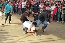Pig wrestling (also known as pig scramble[1] and with the variants hog wrestling and greased pig catching) is a game sometimes played at agricultural shows such as state and county fairs, in which contestants, try to hold onto a pig. In the most common version, a team of four members chases a domestic pig around a fenced-off mud pit and attempts to place it in a barrel, in a race against the clock.[2] In some events the pigs are greased with lard (pig fat), vegetable or mineral oil in order to make catching the pig even more difficult.[3]