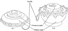 The P-1 has circular plate like body 33.5 centimeters in diameter and 14 centimeters high with a central raised pressure plate. The P-1 uses a 7.0 kilograms (15.4 lb) main charge of TNT.