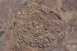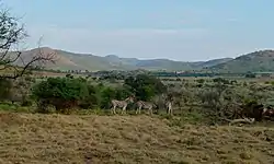 The area lies in the root zone of an extinct volcano, and is defined by alternating ridges and valleys forming concentric rings, a geological formation that rises abruptly in the form of hills 300–600 metres (980–1,970 ft) above the surrounding plains.[2] The Pilanesberg is named for chief Pilane[3] of the Kgafêla people, who ruled from Bogopane, Mmamodimokwana and eventually Mmasebudule during the 1800s.[4] The 'Pilanesberg Alkaline Ring Complex' is the park's primary geological feature. This vast circular feature is geologically ancient, being the ring dikes that fed a completely eroded caldera created by volcanic eruptions some 1,200 million years ago. It is one of the largest volcanic complexes of its type in the world, the rare rock types and formations make it a unique geological feature, and a number of rare minerals occur in the park.