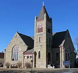 It is built of sandstone walls with limestone used for trim, on an above-ground limestone foundation. Its roof has five gables; the gable ends have parapets with metal caps and limestone cornices. A bell tower is 78 feet (24 m) tall.[2]