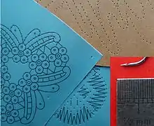Still new types of lace are being developed such as the 3D Rosalibre[16] and a colored version of Milanese lace by borrowing rolls from Duchesse lace to store various shades and colors.[17] Other artists are giving grounds a major role by distorting and varying stitches, pin distances and thread sizes or colours. The variations are explored by experimentation[18][19][20] and mathematics and algorithms.[21] The lace maintaining its shape without stiffening is no longer a requirement.[18] Inspiring journals, guilds and foundations show that old techniques with a new twist can challenge young people to create works that can definitely classify as art.[22] A Dutch design graduate in 2006 discovered bobbin lace was a technique to make a fancy fence. The first fences became museum pieces. The fences are now produced in Bangalore by concrete rebar plaiters.[23]