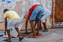 The leader may hide the sticks under stones, on top of short trees, in the grass, or even leave one on the ground just in front of the kids who are waiting. The sticks are generally hidden in a place that is convenient but not easy to find. When the sticks are hidden, the leader shouts "pilolo", and the kids run to search for the hiding sticks. As they search for the sticks they sing a song. One popular song which is sung is "pilolo yafo be mli", a Ghanaian song that literally means "pilolo nobody is expected to cry". A kid who finds a small piece of the stick first may pretend to have not seen it or may pick it up fast when the others are not watching and run to touch the leader. The others would have to do the same. The child who finds the stick is then given a point.