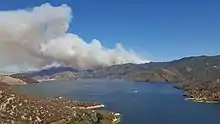 ![]() View of the smoke plume of the Pilot Fire, with Silverwood Lake in foreground, August 07. | |