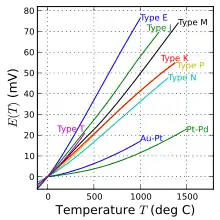 Characteristic functions for thermocouples that reach intermediate temperatures, as covered by nickel-alloy thermocouple types E, J, K, M, N, T. Also shown are the noble-metal alloy type P and the pure noble-metal combinations gold–platinum and platinum–palladium.