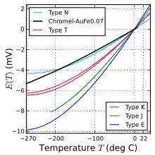 Type E (chromelconstantan) has a high output (68 μV/°C), which makes it well suited to cryogenic use. Additionally, it is non-magnetic. Wide range is −270 °C to +740 °C and narrow range is −110 °C to +140 °C.