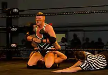 Not to be confused with a schoolboy pin or a backslide pin. The attacking wrestler holds their opponent from behind in a waistlock. The attacking wrestler then performs a backward roll while holding the waistlock. The opponent ends up on their shoulders with the attacking wrestler sitting on top of their legs holding the opponent down. This move is often done when the opponent is leaning on the ropes facing out of the ring and the attacking wrestler would first push forward into the ropes with the waistlock in order to generate faster backward motion. A common heel tactic is to grab the back of the opponents clothing or tights while sitting on top of them or to use the ropes for leverage, thus making the pin illegal.
