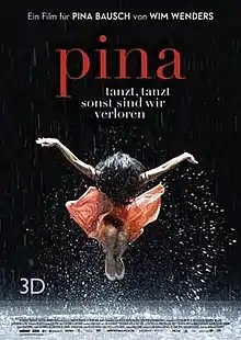 Pina is a 2011 German 3D documentary film directed by Wim Wenders[2] that is about German dancer and choreographer Pina Bausch.[3] On 30 June 2009, during the preparation for the film, Bausch died unexpectedly, so Wenders cancelled the project, but the dancers of Bausch's company, Tanztheater Wuppertal, convinced him to proceed as planned, as a way of memorializing Bausch and some of her choreography.