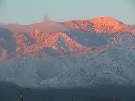 The Pinaleño Mountains (in Yavapai: Walkame—"pine mountains" or in Western Apache: Dził Nnilchí' Diyiléé—"pine-burdened mountain"), are a remote mountain range in southeastern Arizona, near Safford (Ich'į' Nahiłtį́į́), Arizona. The mountains have over 7,000 feet (2,100 m) of vertical relief, more than any other range in the state. The mountains are surrounded by the Sonoran-Chihuahuan Desert. Subalpine forests cover the higher elevations. According to The Nature Conservancy, they traverse five ecological communities and contain "the highest diversity of habitats of any mountain range in North America."[1] The highest point is Mount Graham (Western Apache: Dził Nchaa Sí'an—"Big Seated Mountain") at 10,720 feet (3,267 m). Locals often refer to the whole mountain range as "Mount Graham", in which case the peak is referred to as "High Peak".[2] The mountains cover 300 square miles (780 km2) and are part of the Coronado National Forest, Safford ranger district.