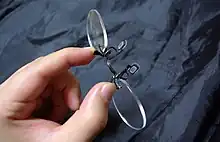 Pince-nez (/ˈpɑːnsneɪ/ or /ˈpɪnsneɪ/, plural form same as singular;[1] French pronunciation: [pɛ̃sˈne]) is a style of glasses, popular in the late 19th and early 20th centuries, that are supported without earpieces, by pinching the bridge of the nose. The name comes from French pincer, "to pinch", and nez, "nose".