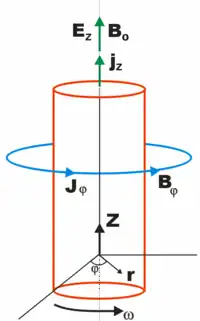The generalized Bennett relation considers a current-carrying magnetic-field-aligned cylindrical plasma pinch undergoing rotation at angular frequency ω. Along the axis of the plasma cylinder flows a current density jz, resulting in an azimuthal magnetίc field Βφ. Originally derived by Witalis,[57] the generalized Bennett relation results in:[58]