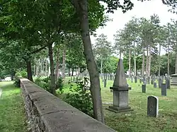 The cemetery is located about 0.5 miles (0.80 km) northeast of downtown Leominster, east of Main Street and south of Tremaine Street. It is roughly rectangular in shape, and is generally level, with a steep rise only near its northern entrance. There are entrances (none accessible to public vehicles) on the north, south, and west sides. The western (Main Street) entrance is for pedestrians only, while the other two have normally locked wrought iron gates. Vehicular circulation is by two grassy (formerly cobbled) roads that run roughly north-south, one of them connecting the north and south gates. Burials in the cemetery, in addition to early settlers and business leaders, include a number of American Revolutionary War veterans.[2]