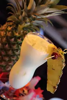 The tepache is made from the skin and core of pineapples, sugar cane and cinnamon.[14] Developed in Puerto Rico as its national drink, the piña colada is a cocktail made with white rum, coconut cream, and pineapple juice.[15] Developed in Singapore, the Singapore sling is a cocktail made with Gin, Cherry brandy, Cointreau, Bénédictine, lemon juice, pineapple juice and bitters.[16] The Staten Island Ferry is a cocktail made of Malibu rum and pineapple juice.[17]