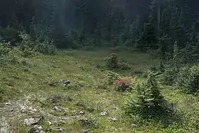 Pinecone Burke Provincial Park has diverse ecosystems that support various animal and plant species. Mammals such as the black-tailed deer, mountain goats, and bobcats have been recorded at the park. The park also has two types of bears, Grizzly and black bears that inhabit the area.[10][16] Pinecone Burke Provincial Park also supports several marine species that live in the park's inlet. These fish are the Pacific salmon, cutthroat and steelhead trout, and the migratory fish Dolly Varden char.[10] Pinecone Burke Provincial Park also has five amphibian species[16] Furthermore, BC's Wildlife inventory has documented 46 different bird species.[16] There are also many fungi and plant species that live in this coniferous forest. Community members have used iNaturalist to record sightings of fungi such as hair ice, the common bonnet and the turkey-tail.[17] Plant species include as licorices and western sword ferns, vine maple, bearberry, swamp currant and bog Labrador tea.[17] Plants like the bog Labrador are able to grow because of Widgeon Valley's nationally-recognized wetlands.[10] Within the park there are diverse tree species that can be found all over British Columbia. Trees such as the western hemlock, Douglas fir, bigleaf maples and red alders are some of the main tree species that grow in the park.[18] There are currently six animal species that are labelled as sensitive or vulnerable: the blue heron, tailed frog, shrew mole, Vaux's swift, Huttons' vireo, and the Pacific Jumping mouse.[10]