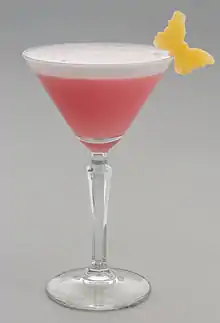 The exact origin of the pink lady is not known for sure. Occasionally its invention is attributed to the interior architect and prominent society figure Elsie de Wolfe (1865-1950), but the recipe associated with her nevertheless clearly differs from the common recipes for the pink lady.[5] The name of the cocktail itself is sometimes said to be taken from the 1911 Broadway musical by Ivan Caryll of the same name,[6] or named in the honour of its star Hazel Dawn[7][8] who was known as "The Pink Lady".[9] During the prohibition era (1920-1933) the cocktail was already widely known. In those years it was a popular drink at the Southern Yacht Club in New Orleans, where it was offered under the name pink shimmy as well. Its recipe was due to Armond Schroeder, an assistant manager at the club.[10] The popularity of the pink lady might partially be explained by the frequently poor quality of gin during the prohibition era, due to which there was a need to mask the gin's bad taste.[11]