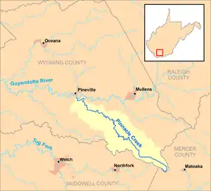 Pinnacle Creek is a tributary of the Guyandotte River, 26.6 miles (42.8 km) long,[3] in southern West Virginia in the United States. Via the Guyandotte and Ohio rivers, it is part of the watershed of the Mississippi River, draining an area of 57.23 square miles (148.2 km2) in a rural area on the unglaciated portion of the Allegheny Plateau.[4]
