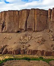 The Pinturas River running through the canyon provided water for herds of guanacos, making the area attractive to Paleoindians.[9] In ancient times, people accessed the canyon through ravines and gorges in the East and West, typically from higher elevations around 600 to 700 meters above sea level.[10] Natives hunted in the area of the canyon because of these plentiful guanaco, which they depended on for their own survival.[11]