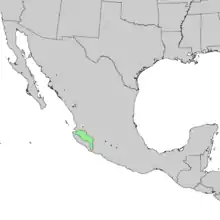 It is found in the southern Sierra Madre Occidental up to the crest of the mountains along the border of Sinaloa and Durango, in the western Trans-Mexican Volcanic Belt in the states of Nayarit, Jalisco, Michoacán, México and Morelos, and locally in the Sierra Madre del Sur of Guerrero and Oaxaca.[1]
