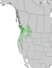 The species occurs in humid areas of the mountains of the Western United States and Western Canada[3] such as the Sierra Nevada, the Cascade Range, the Coast Range, and the northern Rocky Mountains. It can be found in elevations of 600 to 1,800 meters (2,000 to 5,900 ft) above sea level in eastern Washington and Oregon's Blue Mountains[3] and 1,800 to 3,100 metres (5,900 to 10,200 ft) on the western face of the Sierra Nevada as far south as the headwaters of the Kern River.[4][3] The tree often occurs in forests with fir and hemlock species, especially those which are tolerant of shade.[3] It benefits from disturbances that clear away competing species, including low fires that do not destroy all of its cone-protected seeds.[3] It is also well adapted to poor, rocky soils.[3]