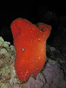Pione vastifica, commonly known as red boring sponge, is a species of sponge found from the Red Sea to western Pacific Ocean. It can grow up to 1 metre (3.3 ft) in size and bore 5 centimetres (2.0 in) into coralline substrate. [1] [2] [3]