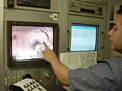 For small diameter pipes there may not be enough room for the tractor mechanism. Instead, a somewhat rigid "fish" is pushed through the pipe and attached to a rope at the access point near the truck. The fish is then pulled to place the rope along the pipe. The rope is then used to pull the inspection pig and cable through the pipe. Detaching the rope, the cable is then used to pull the pig backwards as the pipe is inspected on the monitor (this is the method shown in the illustrations below).