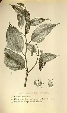 Piper guineense is a West African species of Piper; the spice derived from its dried fruit is known as Ashanti pepper, Benin pepper, Edo pepper, false cubeb, Guinea cubeb, and called locally kale, kukauabe, masoro, etiñkeni, sasema, soro wisa, eyendo, eshasha by the Urhobo people, and oziza and uziza by the Igbo people of Nigeria. It is a close relative of cubeb pepper and a relative of black pepper and long pepper. Unlike cubeb, which is large and spherical in shape, Ashanti pepper grains are prolate spheroids, smaller and smoother than Cubeb pepper in appearance and generally bear a reddish tinge.[1] The stalks of Ashanti pepper berries are also distinctly curved whilst those of cubeb pepper are completely straight.[1] The terms West African pepper and Guinea pepper have also been used, but are ambiguous and may refer to grains of Selim or grains of paradise.