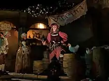 Once guests are out of the tunnel, cannonballs whistle overhead and explosions throw water into the air – a fierce battle in the Caribbean between a marauding pirate galleon, the Wicked Wench, and a Spanish fortress is in full swing. From the deck of the Wicked Wench, the Pirate Captain (modeled on Blackbeard's appearance) leads the assault as colonial defenders can be seen manning the fort's cannons, barking orders to each other in Spanish and shouting threats at the invading pirates. The village of Puerto Dorado on Isla Tesoro is overrun with pirates in search of treasure. The first sight is the town square, where some pirates have kidnapped the mayor, Carlos, and threaten to drown him in a well if he does not divulge the location of the treasure. Carlos' wife peeks out of an upstairs window, telling him to be brave and not talk; she is shot at as Carlos is repeatedly dunked in the water while a line of other captive city officials look on. An auction scene follows, where an auctioneer pirate tries to sell off the local women with the banner, "Take a Wench for a Bride!" The bidders yell out for the "redhead", a flirtatious woman in a red dress. In the next scene, women are being chased through town by pirates. The "Pooped Pirate" reminisces about the "lively lassie" he wished to "hoist his colors" upon. Holding her slip as he prattles on, the woman peers out from inside a barrel that sat right behind the pirate's back as he keeps boasting, unaware.[13]