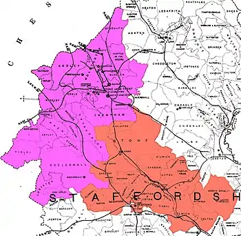 Abandoned although never abolished by legal statute, in 1894 the Hundred was made functionally obsolete with the establishment of urban districts and rural districts in Staffordshire.[8] Of the local government districts created in the 1974 re-organisation, Newcastle-Under-Lyme and Stoke-on-Trent (now a city and unitary authority) fall within Pirehill Hundred, as does the district (or borough) of Stafford except for its southernmost parishes. The districts of Staffordshire Moorlands, East Staffordshire and Lichfield only have one or two parishes each in the old Hundred.[9]