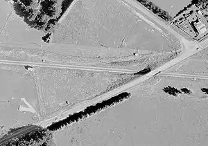 Contracts to clear a line, 66 ft (20 m) wide, through the Seventy Mile bush, for a road, were let in 1871.[27] 1+1⁄2 mi (2.4 km) at the Piripiri Clearing was gravelled in 1881,[28] though in 1882 the bush was still so dense that the trees kept the sun off the road,[29] so it was felled in 1883.[30] It was designated as a Main Highway in 1924,[31] which later became SH2. Between October 2014 and September 2016 NZTA Central Region replaced a narrow bridge over the stream with a culvert and 150,000 m3 (5,300,000 cu ft) of fill,[32] 120 m (390 ft) long, 6 m (20 ft) wide and 3 m (9.8 ft) high, on a reinforced concrete slab foundation and a Super-Cor Arch Culvert (corrugated iron and concrete),[33] with 16 m (52 ft) of rockfill on it, some 3 m (9.8 ft) lower than the previous bridge.[32] The previous 1927 bridge,[34] which replaced a level crossing,[35] was a 22 m (72 ft) high viaduct, 5.79 m (19.0 ft) wide between kerbs and 58 m (190 ft) long, with a reinforced concrete deck.[32] There had been a fatal crash at the level crossing in 1913.[36]