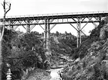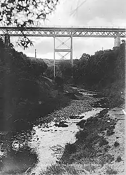 J & A Anderson & Co of Christchurch won a tender[64] for a steel and concrete replacement.[65] It was rebuilt in 1899[66]-1900,[67] 10 ft (3.0 m) higher than the original bridge.[68] The new Piri Piri Viaduct was tested under the weight of five locomotives in December 1900[69] and put to use on 31 January 1901.[1] In the same era Andersons also rebuilt Kopua (1895), Makotuku (1898), Mangatera (1900), Ormondville (1906) and Makatote (1908) viaducts.[70] There was a fire on the bridge on 29 October 1933.[1] Underpinning with reinforced concrete beams was tendered for in 1969.[71]