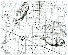While the astrological sign Pisces per definition runs from ecliptic longitude 330° to 0°,[6] this position is now mostly covered by the constellation of Aquarius due to the precession from when the constellation and the sign coincided. Today, the First Point of Aries, or the vernal equinox, is in the Pisces constellation.[7][3] There are no prominent stars in the constellation,[3] with the brightest stars being of only fourth magnitude.[8] One star in the constellation, Alpha Piscium, is also known as Alrescha, which comes from the Arabic الرشآء al-rišā’, meaning "the well rope,"[9] or "the cord."[8] The constellation, however, is different from the astronomical location in where the sign occupies space. The constellations in earlier times were primarily used as markers to help determine what influence was in the sky. Nevertheless, the sign of Pisces remains in the 30-degree span of 330°-0°.