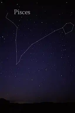 Pisces is a constellation of the zodiac. Its vast bulk – and main asterism viewed in most European cultures per Greco-Roman antiquity as a distant pair of fishes connected by one cord each that join at an apex – are in the Northern celestial hemisphere. Its old astronomical symbol is