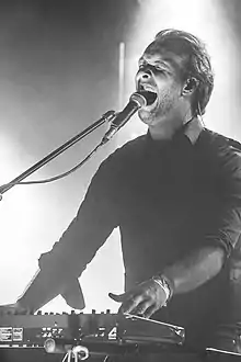 "Below" was the earliest song put in writing, originally assembled with piano and vocals.[11] Its music video was directed by Dariusz Szermanowicz and shot in Wrocław, Poland.[12] "I Lose Hope" was frowned upon in its infancy, but reached new potential in studio, at which point Børven and drummer Baard Kolstad applied a groove reminiscent of hip hop. "Observe the Train" endured the most iterations of the album for its desired outcome. According to Solberg, it is about the mindfulness of one's train of thoughts; the need to "stop fighting and start accepting" despair. Dissatisfied with "Alleviate", he abandoned all but the pop-based chorus chord progression and verse notes that would later be improved through vocal lines.[7][10][13] Troll Toftenes helmed the video for the song.[14] Weinroth-Browne inserted harmonic and pizzicato elements to "Alleviate". His solos on "At the Bottom" and "Distant Bells" were improvised.[5] Although mostly an acoustic player, Kolstad used electronic drums on "Below", "At the Bottom", and "Distant Bells".[15] Instrumentation for the latter was composed by Børven, drawing on the idea of creating something out of nothing with influences from his Nordic jazz and symphonic pop background.[16] He employed a grand piano at the start to maintain intensity despite the low dynamics.[17] Suhrke did the preliminary sketch;[5] Solberg brought about the melodies, vocal lines, lyrics, and some arrangements.[13] There was doubt about whether to incorporate "Foreigner", but they discovered it worked well as a passage between "Distant Bells" and the finale.[6] A classical choir in Belgrade, Serbia, was booked for "The Sky Is Red",[4][5] causing the full piece to contain hundreds of sound layers. It was almost entirely written and composed in an hour and a half, when Solberg was immersed in a flow state.[7][15]