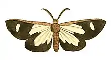 Upperside: antennae long and pectinated (comb like). Thorax spiral. Neck orange. Thorax and abdomen dusky grey. Anterior wings about halfway from the tips black, but at the base are of a pellucid (transparent) white; being surrounded along the anterior edge and part of the posterior with black; an oblong white spot is placed near the tips on the black part. Posterior wings black and white; the white entirely surrounded by the black, which on the anterior and abdominal edges is very narrow.