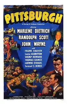 Pittsburgh is a 1942 American drama film directed by Lewis Seiler and starring Marlene Dietrich, Randolph Scott, and John Wayne.[2] Based on a story by George Owen and Tom Reed, the film is about an ambitious coal miner who values wealth and power in the Pittsburgh steel industry over his friends, lovers, and ideals, only to find himself deserted and alone at the top. When his fortune crumbles around him, he discovers that fate offers him an unexpected second chance. Filmed partially on location in Pittsburgh, Pennsylvania, the film co-stars Shemp Howard of Three Stooges fame in a rare dramatic role. Dietrich, Scott, and Wayne also made The Spoilers together that same year. Scott received top billing over Wayne in both films despite the fact that Wayne's roles were larger and more important.