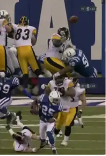 January 14, 1996: Trailing by four points (20–16) and with five seconds remaining in the AFC Championship Game, the Indianapolis Colts needed to score a touchdown to defeat the Steelers, with the winner advancing to Super Bowl XXX. With the ball at the Steelers' 29-yard line, Colts QB Jim Harbaugh lofted a pass into the corner of the end zone. The pass seemingly hung in the air forever, and was batted down by Steelers defensive back Myron Bell. However, the ball was knocked straight down onto the stomach of fallen Colts WR Aaron Bailey. On the television camera feed, the view of the ball was lost for a split second, after which Bailey had possession of the ball. The Colts immediately began signalling touchdown, and the Steelers defensive backs vehemently signaled incomplete. The back judge, however, ruled that the ball hit the ground, and after a lengthy discussion, the referee declared the pass to be incomplete – which other camera angles would show was correct.[14]