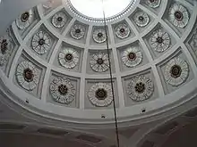 The building has a colonnade of Ionic columns; the interior houses a ballroom on its ground floor. Further Ionic columns support a gallery under a dome from which music might be played; on upper floors there were a billiard room, library and reading room. Above the colonnade are three statues, by Lucius Gahagen, erected in 1827, of the goddess Hygieia, Aesculapius and Hippocrates.[2]