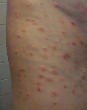 | Photo of the Pityriasis lichenoides et varioliformis acuta or Mucha Habermann's Disease, showing the right leg | |