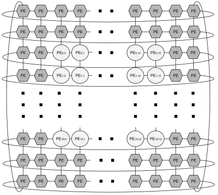 The STP has a 2-D array of PEs: for example, a 16x16 array of full PEs and four lanes of simplified PEs called "halo". The STP has a scalar processor, called scalar lane (SCL), that adds control instructions with a small instruction memory. The last component of an STP is a load store unit called sheet generator (SHG), where the sheet is the PVC memory access unit.[2]