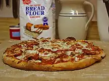American pizza (particularly thin-crust) is made with a very high-gluten flour (often 13–14% protein content) of the type also used to make bagels; this allows the dough to be stretched thinly and thrown vigorously without tearing. Unlike Italian pizza,[10] American pizza often has vegetable oil or shortening mixed into the dough. This can range from a small amount in relatively lean doughs, such as New York style, to a very large amount in some recipes for Chicago-style deep-dish dough.