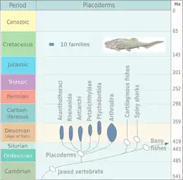 The first identifiable placoderms appear in the fossil record during the late Llandovery epoch of the early Silurian.[5] The various groups of placoderms were diverse and abundant during the Devonian, but became extinct at the end-Devonian Hangenberg event 358.9 million years ago.[6]