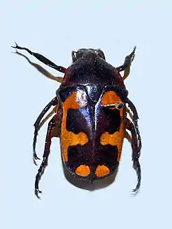 Plaesiorrhina mhondana can reach a length of 20–25 millimetres (0.79–0.98 in). The basic colour is dark brown, with an orange markings on the elytra.[2][3]